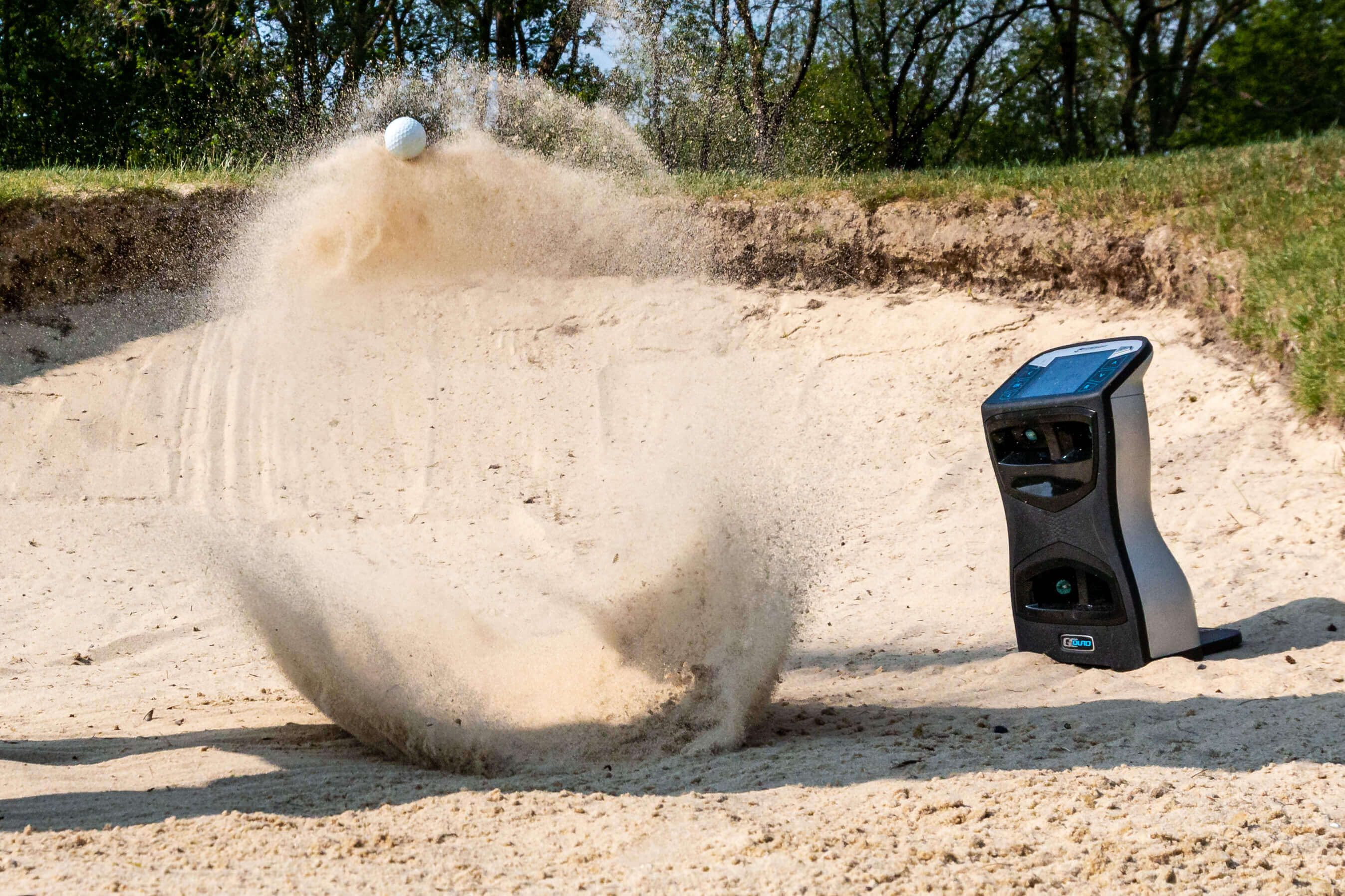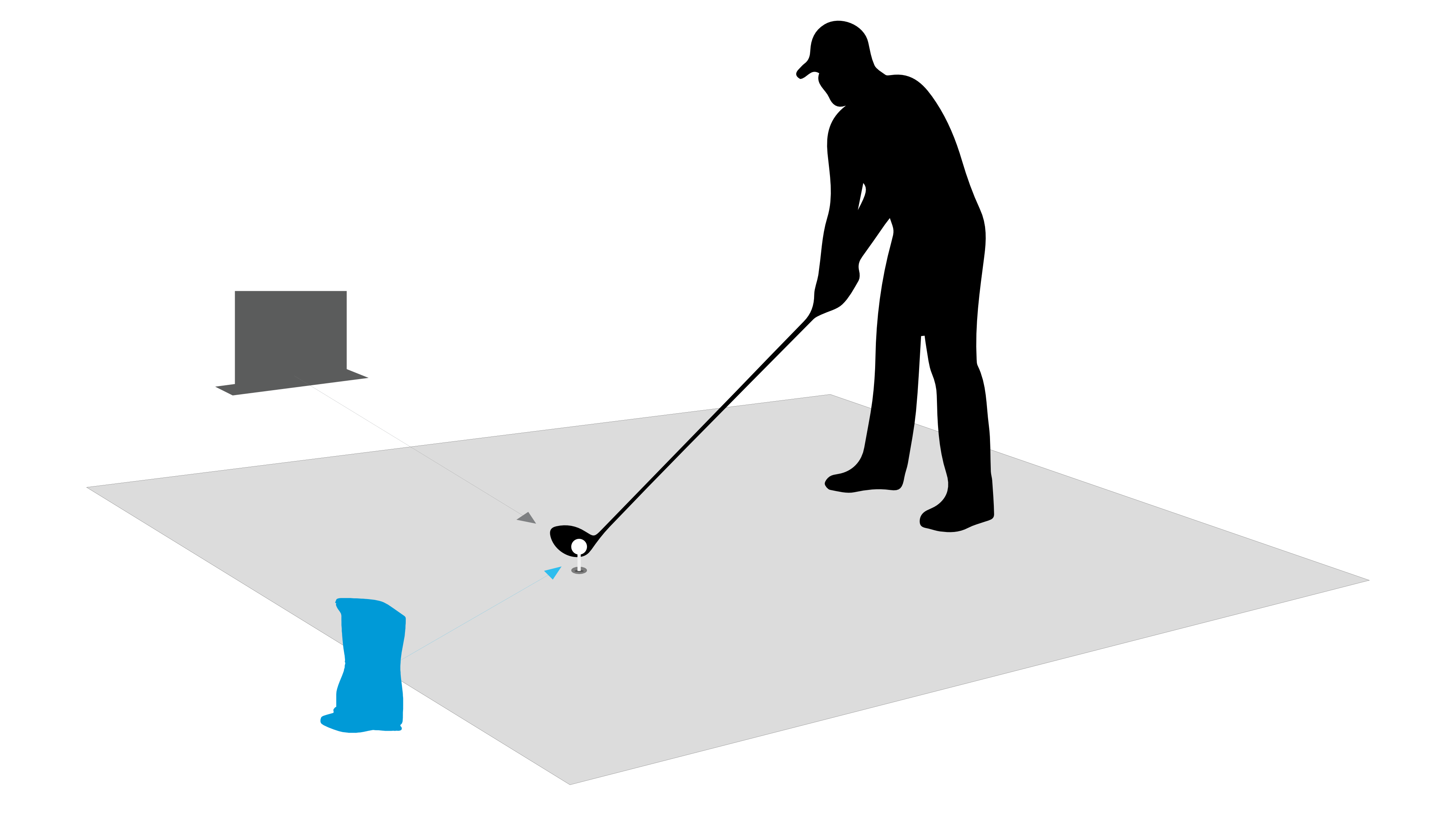 The GCQuad is positioned just in front of the golf ball, to the side of the golfer. From there, the cameras can look back towards the approach of the golf club, allowing it to take direct images of the face itself. From this position, the GCQuad can also measure the exact impact point of the golf ball on the club face.